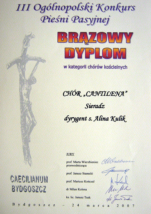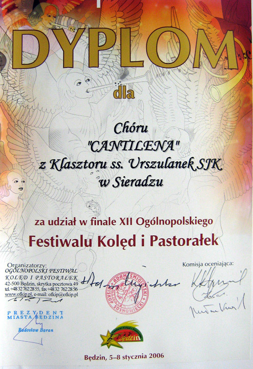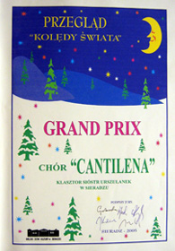 Przy naszym klasztorze w Sieradzu przez 15 lat śpiewał chór Cantilena. Założycielką i jednocześnie prowadzącą chór była S. Alina Kulik USJK mgr wychowania muzycznego. Chór regularnie śpiewał podczas liturgii w klasztorze oraz na zaproszenie w okolicznych kościołach. Dawał koncerty, wykonując muzykę religijną oraz świecką. Był czynnie zaangażowany w działalność charytatywną na rzecz XIII wiecznego klasztoru, przy którym śpiewał, organizując koncerty, a także inne imprezy społeczne.