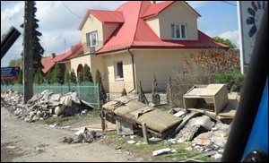 (...)Trześń leży tuż za Sandomierzem, tak blisko miasta, że z powodzeniem mogłaby być jego dzielnicą. Jadąc przez Sandomierz nie byliśmy przygotowani na to, co zobaczyliśmy tuż za mostem na Wiśle. Zjechaliśmy z niego i nagle wjechaliśmy na ulice zawalone stertami śmieci, rozwalonych mebli, gruzów i zaschniętego błota. Pobocza były tym tak zastawione, że dwa większe samochody nie mogły się minąć. Widok na podwórka był jeszcze gorszy. Przywodził na myśl, nie wiem, krajobraz po wybuchu bomby. Ściany domów pociemniałe, bo jeszcze mokre albo odarte już z tynku do wysokości pierwszego piętra. Okna najczęściej zupełnie bez szyb, albo powybijane, albo gołe już wykusze okienne. Podobnie rzecz się miała z drzwiami wejściowymi. Niektóre odpłynęły, inne pościągano, bo napuchnięte wodą już się nie zamykały. Ogrody zupełnie zniszczone, szczególnie iglaki przedstawiały żałosny widok. Dokąd sięgała woda, czyli do wysokości pierwszego piętra, pokryte były gęstym, zaschniętym mułem zmieszanym z ropą. Wyglądały jak zasuszone mumie o żywych, zielonych głowach. Z kolei nowo założone ogródki wyglądały jak dno wyschniętego koryta rzeki. Muł wysechł i popękał tworząc skorupę. Gdzie niegdzie wystawało jakieś zamulone drzewko. Koszmarny widok(...)