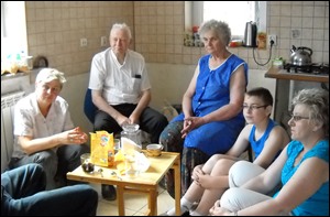 (...)Naszych powodzian znaleźliśmy dość szybko. W domu byli tylko dziadkowie z wnukiem, ale niebawem dojechali inni członkowie rodziny. Zaproszono nas do mieszkania i ugoszczono kawą. Siedzieliśmy na przygodnych siedziskach (jakieś krzesełko z garażu, krzesełko dziecinne, zgrzewka wody mineralnej.) przy stoliczku zrobionym chyba z części fotela(?). O tym, że ktoś przyjedzie z pomocą powiedziała im siostra urszulanka, która u nich była. Nie wiedzieli jak się nazywała. Pan domu powiadomił o tym swoją żonę (bo nie było jej wtedy w domu), a ona odebrała to jak kolejną obietnicę, których usłyszała już wiele. Realnych kształtów nabrała dla niej ta pomoc, gdy zadzwoniłam kilka dni przed przyjazdem i zapytałam czy potrzebna jej chłodziarko-zamrażarka, czy raczej osobna zamrażarka i osobna chłodziarka. Była w szoku. Wtedy pierwszy raz usłyszała o tym, że chcemy się z nimi podzielić tym co zebraliśmy na Jarmarku, pierwszy raz usłyszała w ogóle o Jarmarku, o naszym klasztorze, o Cantilenie. Teraz, siedząc przy kawie, musiałam jej wszystko dokładnie opowiedzieć, dałam jej nasze płyty, adres mailowy na naszą pocztę. Oni z kolei zaczęli nam opowiadać o swojej tragedii. O pierwszym zalaniu w 2001 roku, kiedy to tynki w środku same spadły i potem położyli porządne, nowe. Na lata. Teraz każą im je znowu zedrzeć, ze względu na to, że są obecnie siedliskiem zarazków i bakterii. A oni niczym nie mogą tych tynków ruszyć. Tak rzetelnie je zrobili.