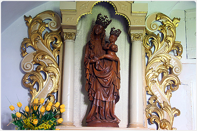 Madonna gotycka - pe³na niezwyk³ego uroku w postawie i ekspresji. Rze¼ba w lipowym drzewie z lat 1420 - 1430. Autor Madonny nieznany, pierwszorzêdny artysta snycerz; ¶ladów polichromii prawie nie ma, korony rze¼bione w drzewie i jab³ko - zaginê³y.